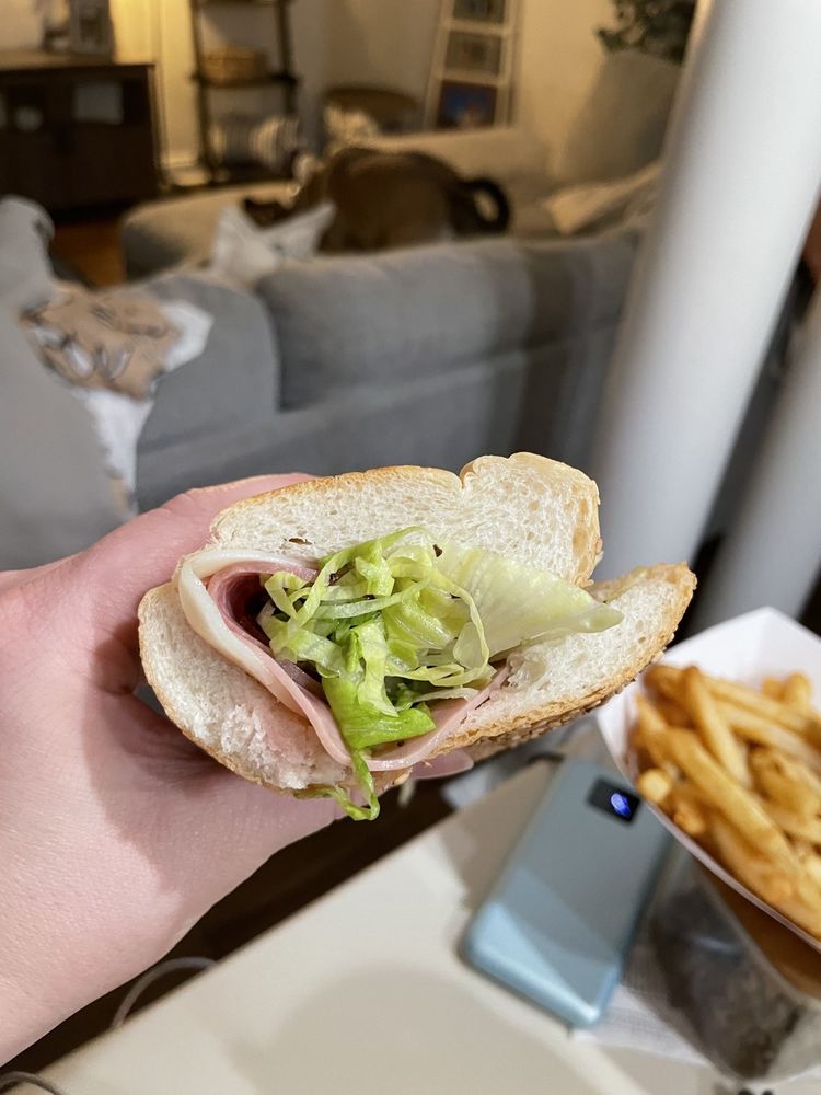 On a kaiser roll with lettuce, tomato, onions and side fries.
